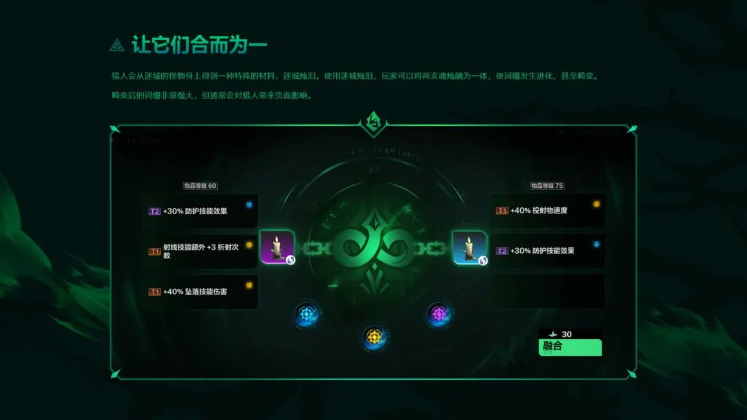 除了值得玩家们在迷城反复刷取的“残垣印记”外,迷城还会掉落一种全新的装备道具“魂烛”,玩家可以将其装备在角色配备的技能中,大幅提升英雄的技能效果,进一步提升角色强度。而作为技能专属的新装备,魂烛自然也配备大量的随机词缀供玩家升阶、进化、甚至是畸变。