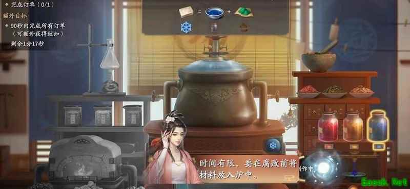 玩家需按订单合成物品,通过点击右侧对应颜色的瓶罐来提取材料完成任务。