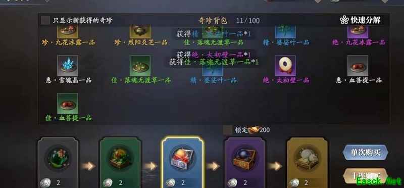 位于左下角的奇珍阁可使用内库珍宝抽取奇珍。奇珍能镶嵌在经脉两侧的槽位中,提升角色基础属性。还可通过消耗其他奇珍进行升级。建议优先镶嵌高品质奇珍,以减少后期频繁更换,提升培养效率与属性收益。