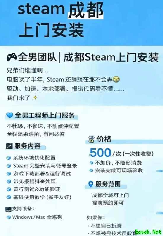 一款名为“Steam 上门安装”的服务近期引发热议,标价高达500至1000元/次。服务内容涵盖本地部署、上门安装、调试运行、功能验证以及基础使用指导等,采取一口价模式,声称无额外收费。
