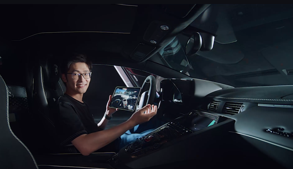 发布会现场,Tim更是坐进兰博基尼驾驶舱,拿游戏车内视角与真车直接比拼,感叹游戏品质打磨之用心。