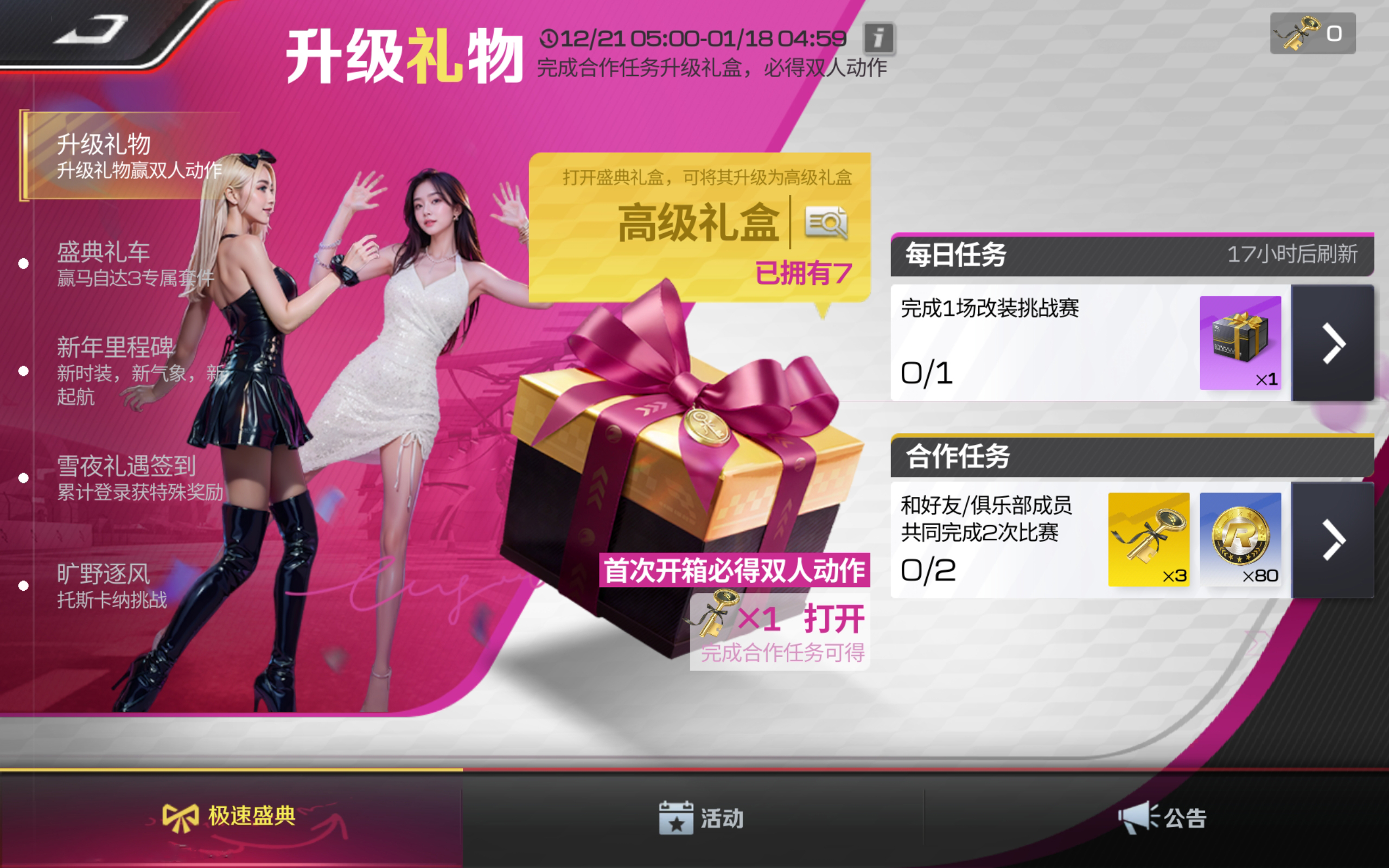 极速盛典主题活动“升级礼物”持续进行中,完成每日任务即可打开盛典礼盒领取奖励。叫上车友共同完成合作任务,即可获得合作钥匙打开高级礼盒,首次打开高级礼盒必定获得全新双人动作【双人成行】,还有限定【车顶装饰】、【极速盛典头像框】、海量钻石等奖励等你来开盒!