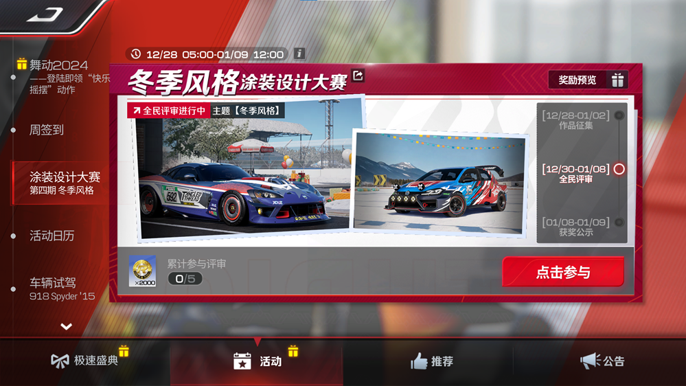 【冬季风格】涂装设计大赛投稿阶段现已结束,今日起至1月8日,所有车手均可参与评审为喜欢的作品投票,累计评审5个作品还可获得2000金币的奖励。好作品能够“C位出道”离不开每位评审车手的投票,赶快上线参与评审赢取奖励吧!