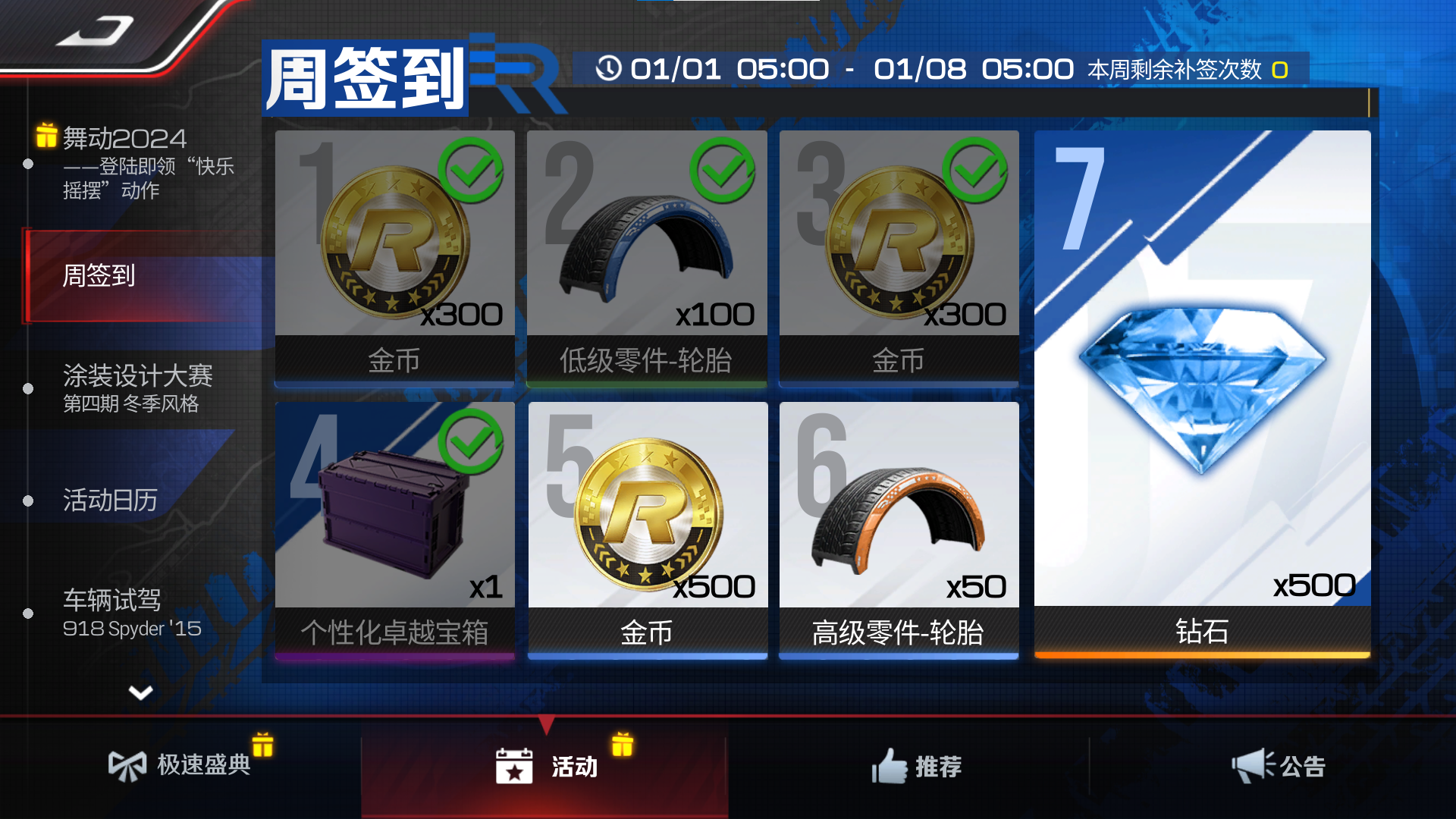 此外,登录《巅峰极速》连续签到7天即可直接领取500钻石!即使抽不开身漏签了一两天也没关系,钻石补签也能稳赚不赔!