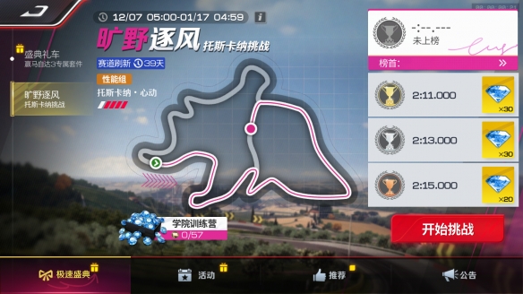 全新赛道“托斯卡纳”挑战活动——旷野逐风现已上线。使用指定组别参与新地图圈速挑战,达到指定成绩要求,即可获取80钻石。赛程每周更新,全新意式小镇等你来探索!