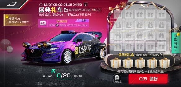 S5赛季期间,完成每周系列任务和限时挑战任务即可获取金币、钻石和装扮礼券。累计进行20次装扮,即可免费获得马自达 Mazda3 Hatchback '20专属套件奖励【极速雷霆】!