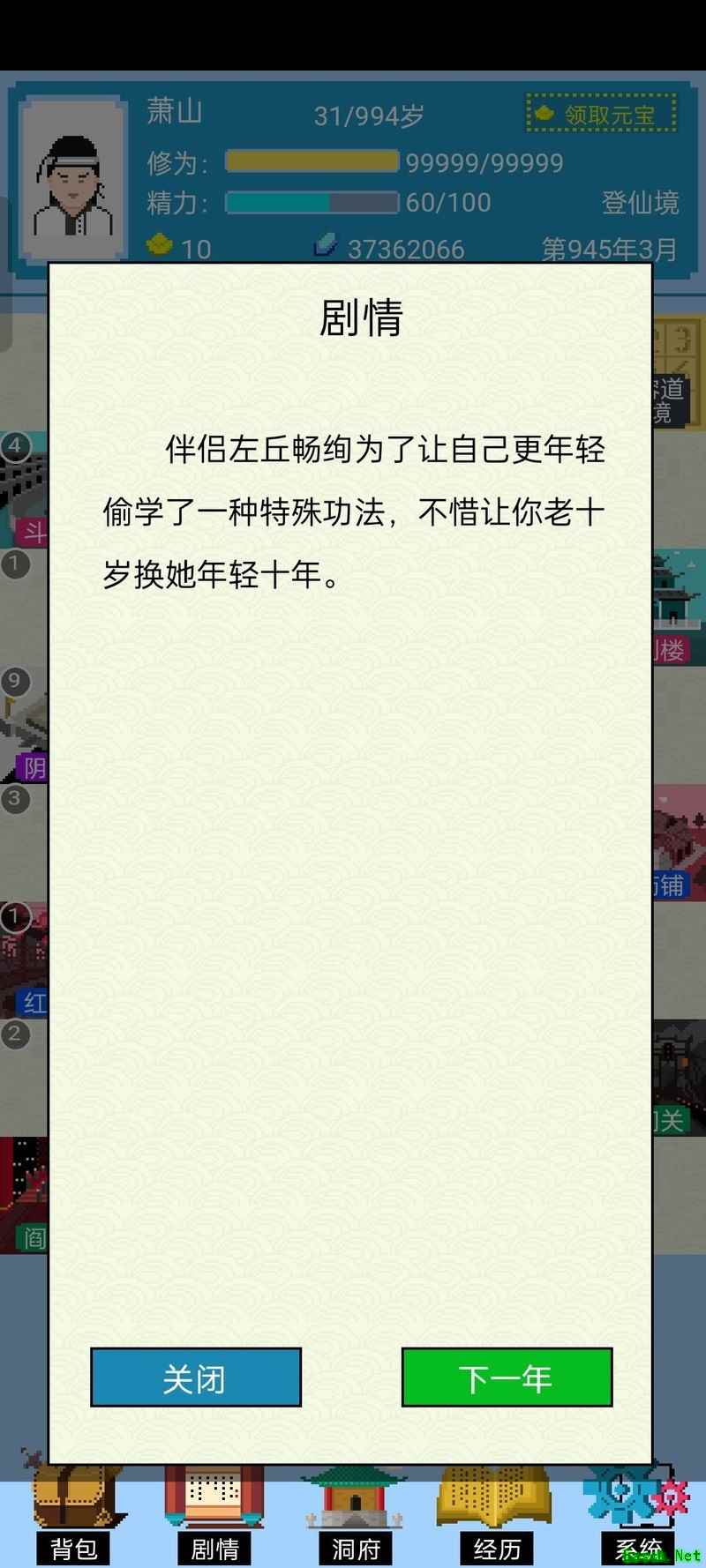 最关键的剧情是,当你点击下一年时,会触发一个剧情:你的伴侣为了追求长寿,使用秘法将自己年轻十岁,而你则变老十岁。原本十六岁成仙的伴侣因此变成了六岁登仙。这时再对这个六岁之躯施展移魂咒,便成功实现了六岁登仙的设定。