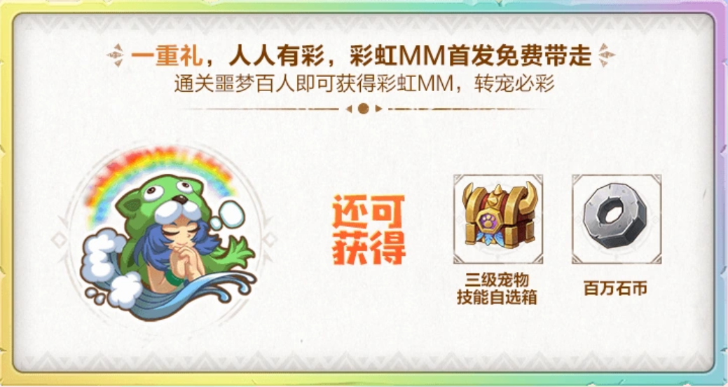 宠物成长是《石器时代:觉醒》中玩家战力组成的重要部分,为了让玩家更好的养成极品宠物,《石器时代:觉醒》在周年庆版本中开启挑战百人道场赢彩虹MM活动。周年庆版本更新后,玩家通关百人道场噩梦难度即可获得彩虹MM、3级技能自选、百万石币等奖励。彩虹MM可助力伊甸园及之前版本所有1000金贝档的重生宠物进行转生,彩胚转生后必得彩宠。如果玩家想要免费获得彩宠,那么快来挑战百人道场吧!