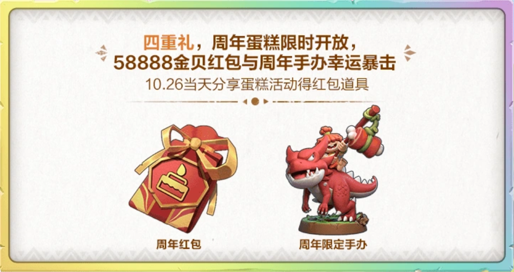 《石器时代:觉醒》周年庆是为了庆祝游戏公测一周年,也是为了感谢广大玩家的支持与陪伴。周年庆典开启时,《石器时代:觉醒》在村长家门口为大家准备了周年庆蛋糕。活动期间,玩家可以分享周年庆蛋糕,每天分享蛋糕都可以获得一个蛋糕礼盒。在周年庆当天(10月26日)可以额外领取庆生礼盒,使用后可获得绑定金贝,有几率获得58888绑定金贝和周年限定手办!