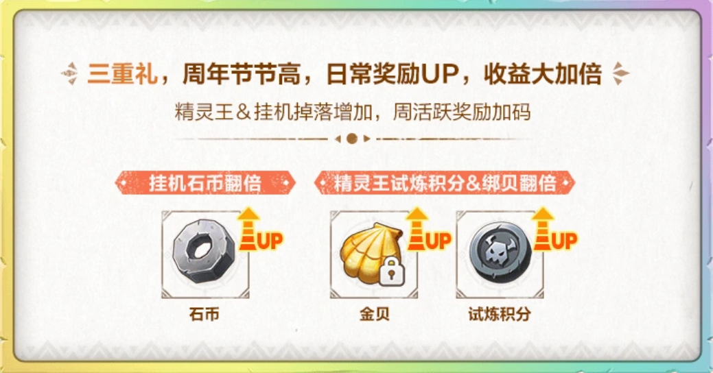 周年庆活动期间,为提升玩家的日常收益。《石器时代:觉醒》将挑战日常活动的奖励倍数,诸如精灵王试炼,精灵王积分、绑定金贝将翻倍掉落,以及挂机将获得翻倍石币!且周年庆活动期间,《石器时代:觉醒》对周活跃奖励进行限时加码,届时百宝袋、经验卡等惊喜道具也会现身其中,增加奖励力度。