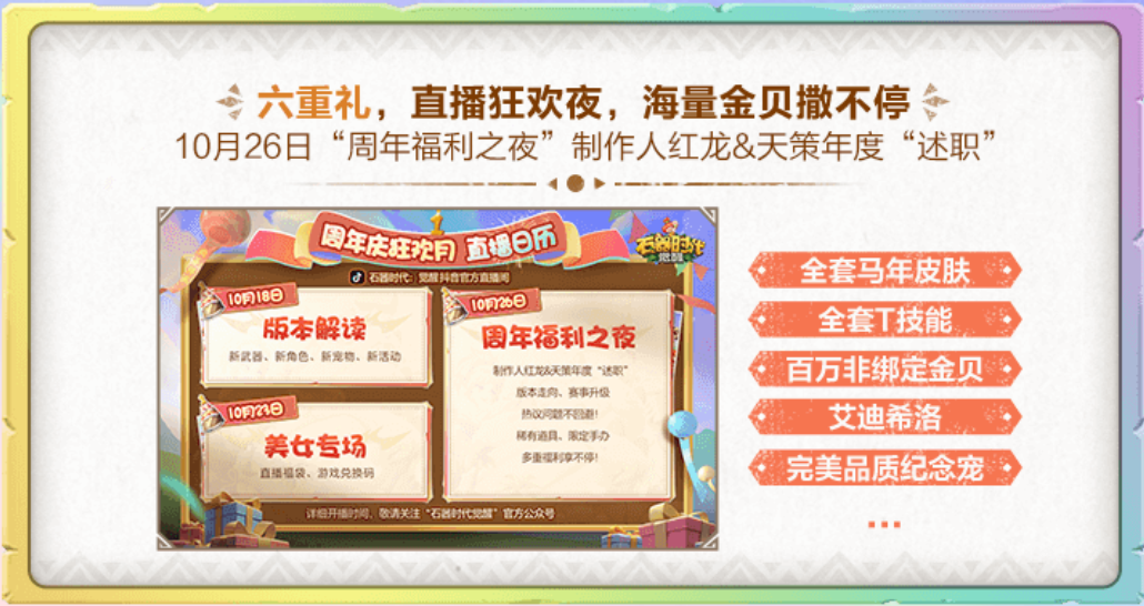 伴随着周年庆的到来,《石器时代:觉醒》将在2024年10月26日晚开启“周年福利之夜”年度大直播!制作人红龙&天策现身直播间年度“述职”,为玩家带来版本走向、赛事升级等玩家关注的热门话题!并为玩家分享新角色、新宠物、新武器等版本内容。玩家在10月26日观看直播,更有海量豪华奖品送出!其中包括周年庆限定实体手办、全套马年皮肤、全套T技能、百万非绑定金贝、艾迪希洛、完美品质纪念宠、豪华金色料理包等等!海量奖励不容错过!