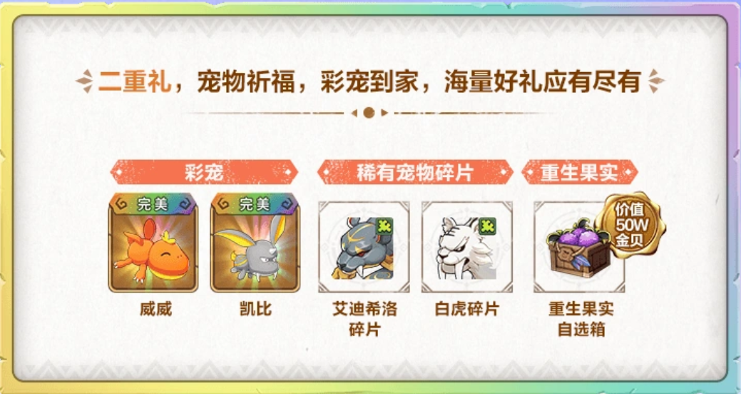 如果说挑战百人道场需要一定的实力,那么接下来的彩宠到家活动绝对适合所有玩家!在周年庆活动期间,玩家参与竞技场、尼斯大擂台、精灵王、元素神殿等活动,可获得许愿道具。之后玩家使用许愿道具参与祈福许愿活动,即可获得彩色1转140级威威和凯比、白虎、机豹碎片,宠物重生果实等好礼。