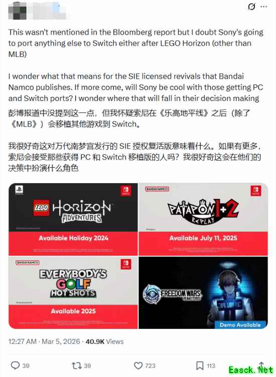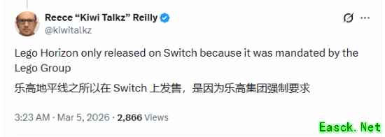 针对网友关于“索尼在《乐高:地平线冒险》之后恐怕不会再移植任何第一方游戏到Switch(除了MLB)”的推测,Reece Reilly直接回应称:“《乐高:地平线冒险》之所以登陆Switch,完全是因为乐高集团的强制要求。”