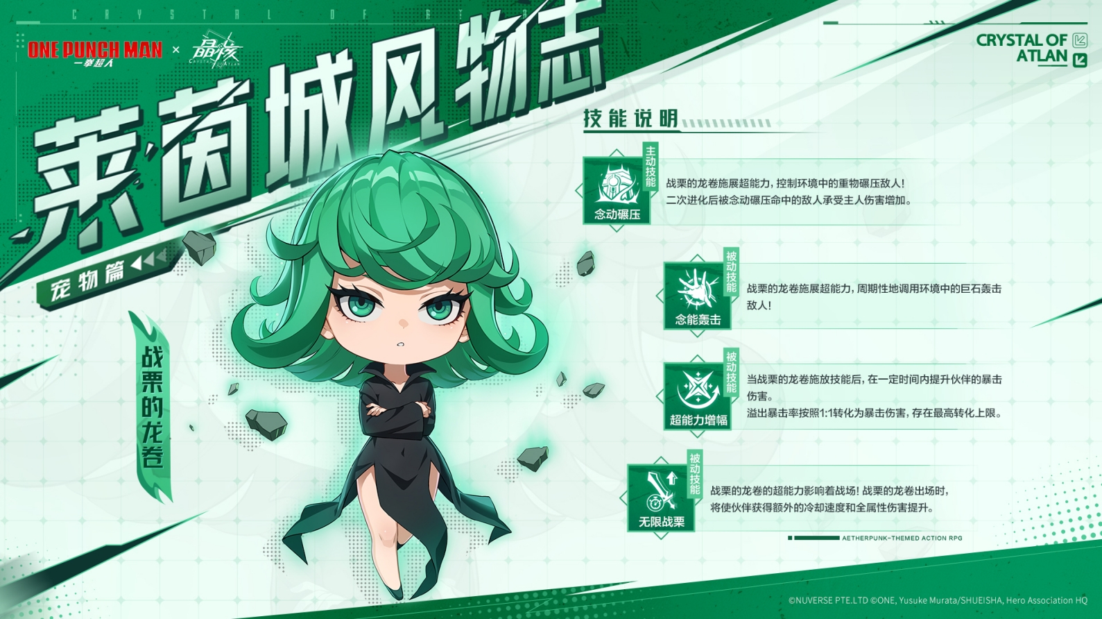 全新宠物「战栗的龙卷」加入阿特兰世界,这位来自《一拳超人》英雄协会的超能力强者,在观众中拥有超高人气。在游戏中将会以她无与伦比的力量协助玩家战斗,让你可以掌握属于《一拳超人》世界的独特能力。