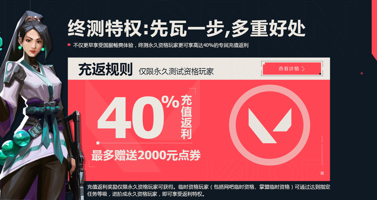 本次终测《无畏契约》将开启相关付费功能,拥有永久测试资格的玩家,将在未来国服公测时,享受本次测试期间充值金额140%的等额无畏点券返还。