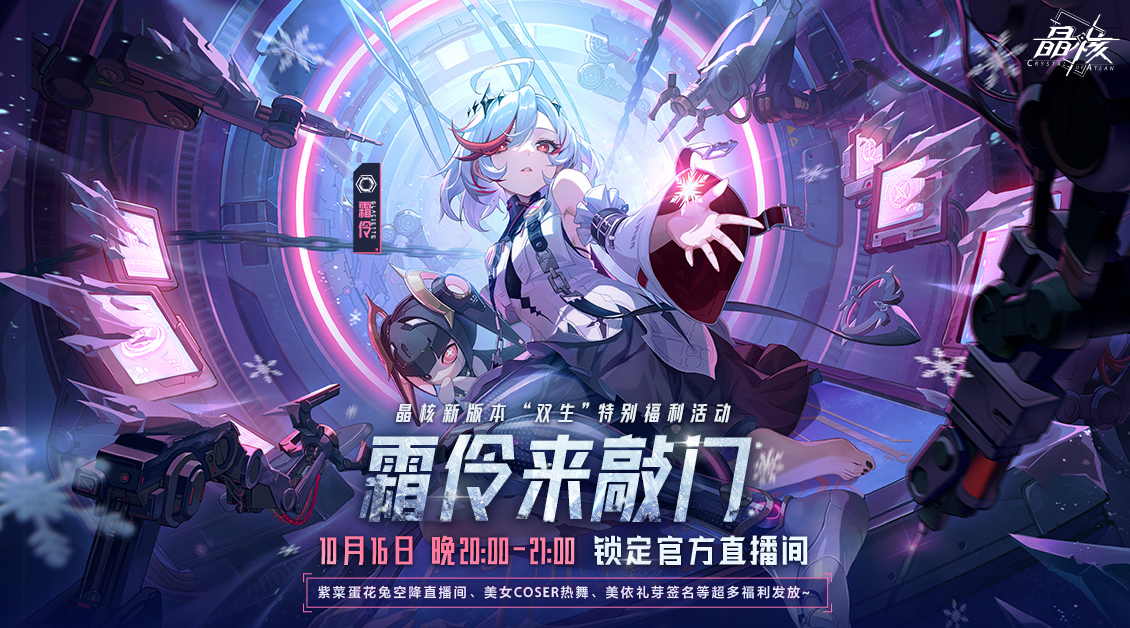 10月16日晚8点-9点,霜伶来敲门!晶核官方直播间 “双生”特别福利活动准时开启。
