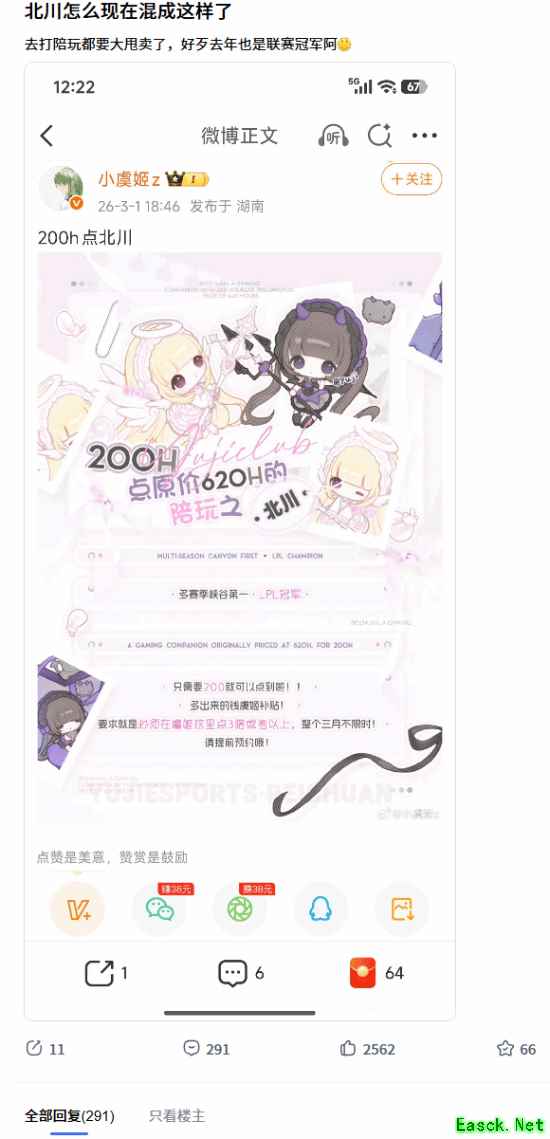 近日贴吧热议,LPL知名选手,25年联赛冠军,参加过MSI的世界赛级别选手北川beichuan,在微博上被知名陪玩店老板小虞姬公开叫卖陪玩时间,一个小时两百块钱。