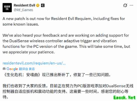 卡普空(Capcom)今日正式为系列新作《生化危机:安魂曲》(Resident Evil Requiem)推送了最新版本补丁。除了常规的恶性BUG修复,官方还带来了一个令PC玩家欣喜的重磅承诺:PC版将正式追加对DualSense无线控制器特性的支持。
