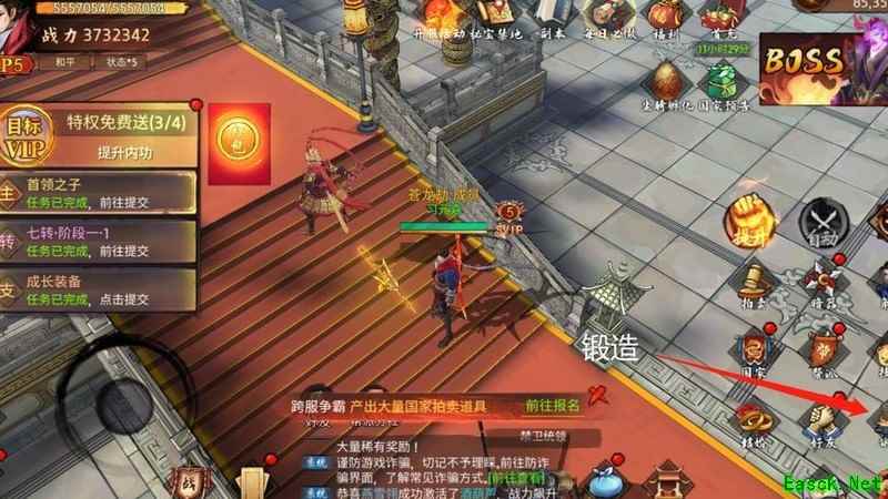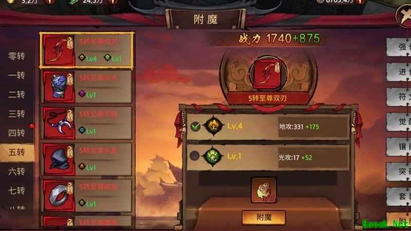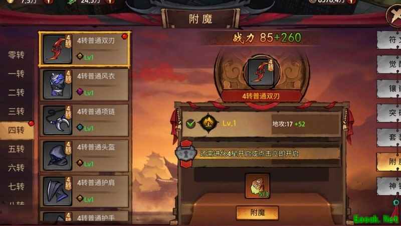 从游戏主界面进入锻造功能,可对四转及以上装备进行附魔升级,提升装备属性与战斗力。