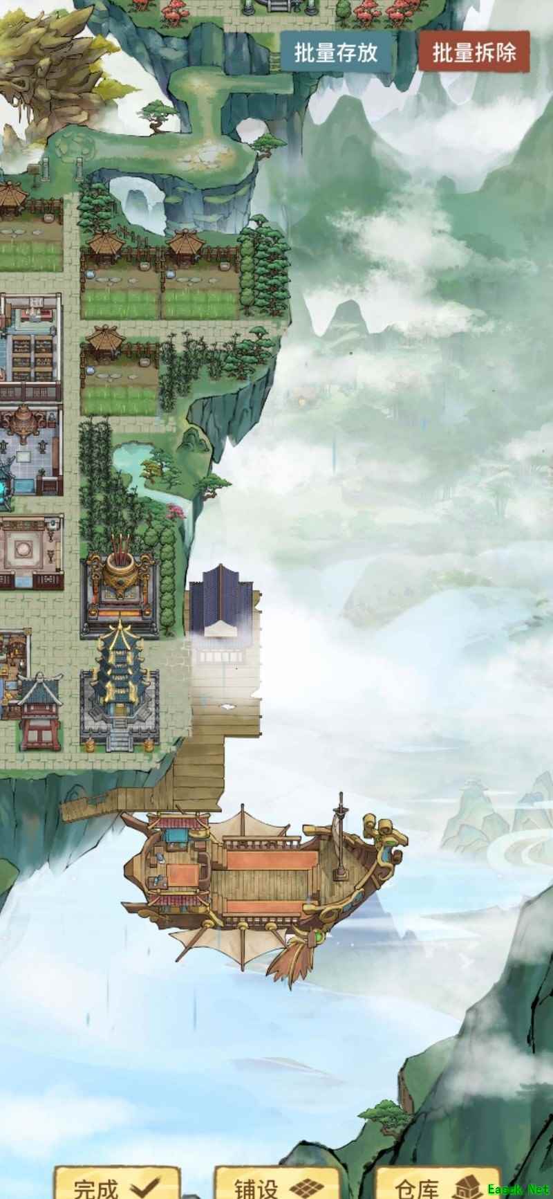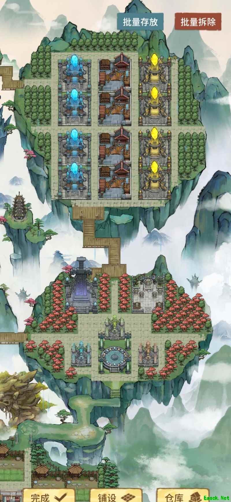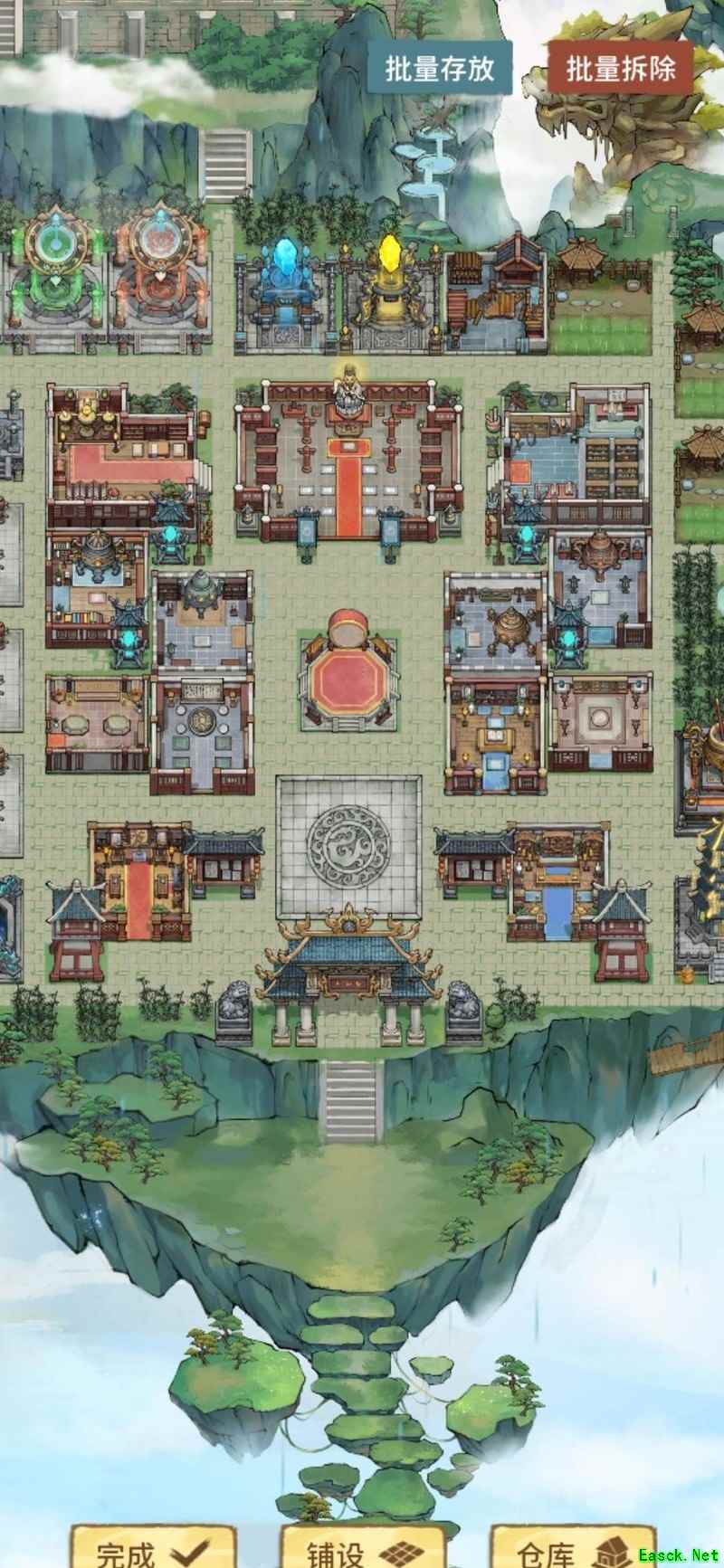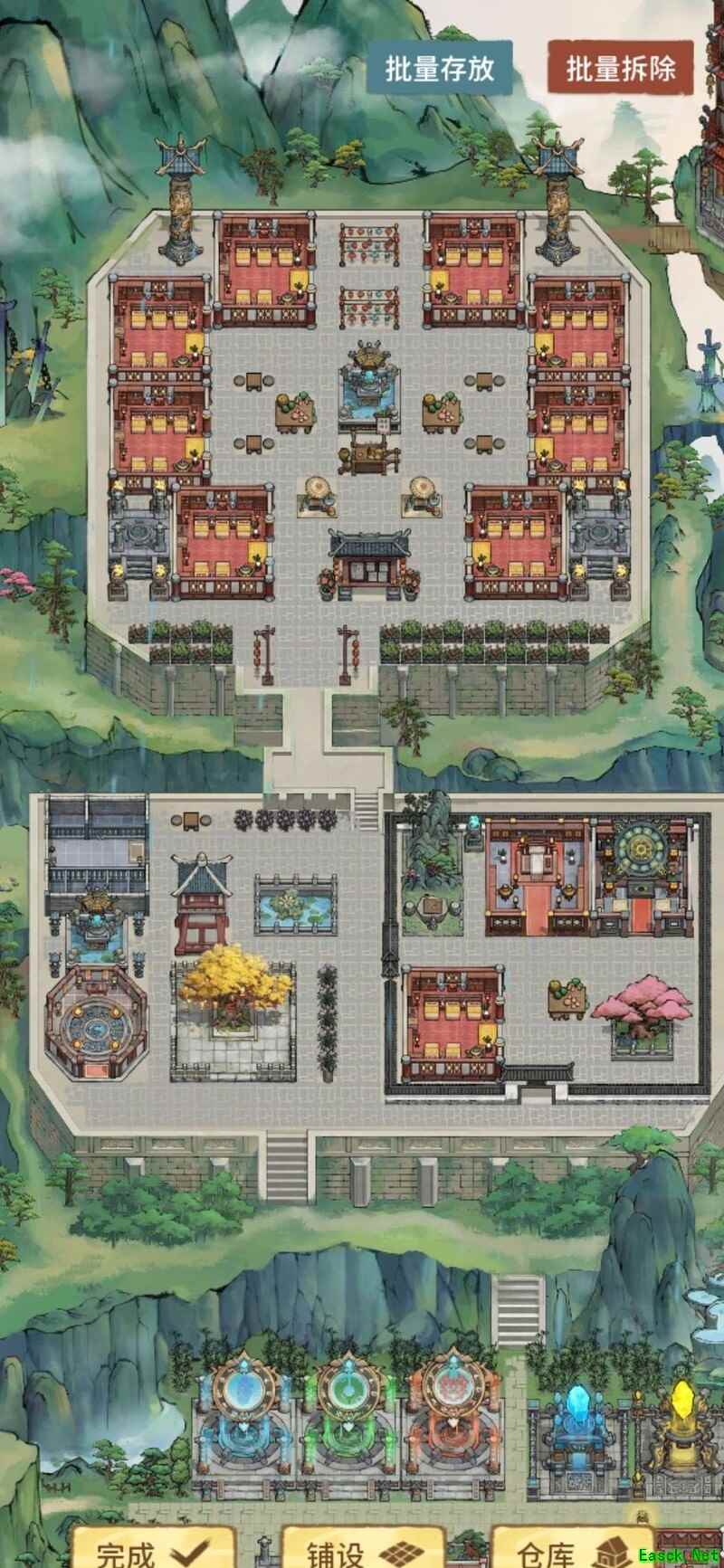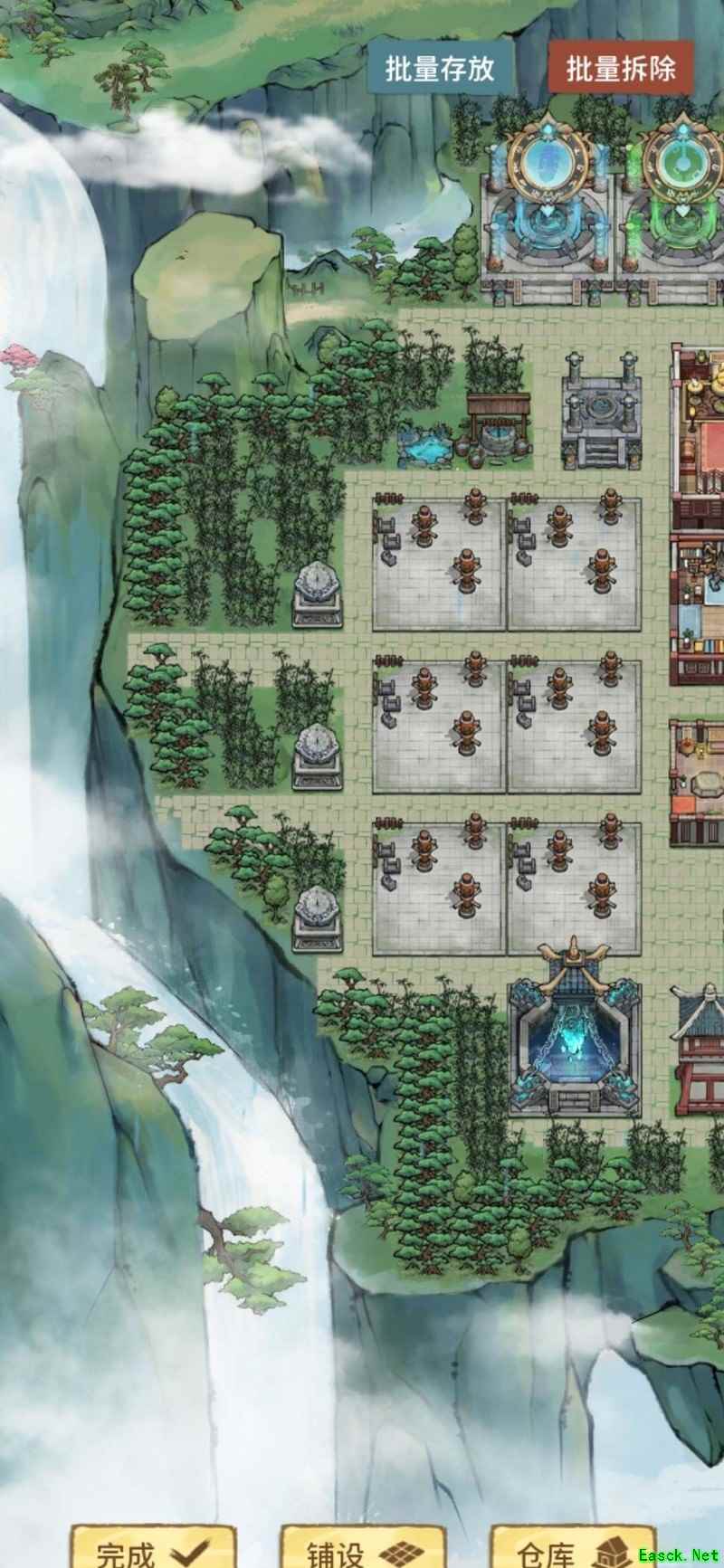 祖师殿后一排生产建筑,各建其一,点击即可一键全收。
