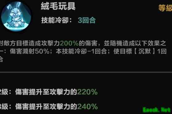二技能毛绒玩具伤害可观,且具备指向性优势,特效触发任意效果都极具收益,尤其是沉默效果,施加于关键敌人时,往往直接影响关卡成败。