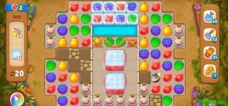 本关中元素被锁链束缚,需先解除锁链。锁链无法通过交换消除,必须通过匹配元素生成雷管炸弹将其炸开,每条锁链只需引爆一次即可彻底清除。