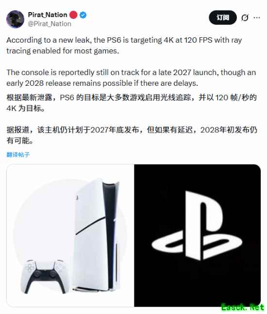 2026 年 3 月 7 日,海外游戏博主 Pirat_Nation 发布爆料称,索尼下一代主机 PS6 的核心性能目标为支持多数游戏在 4K 分辨率下以 120FPS 运行并开启光线追踪,同时透露其预计 2027 年底正式发布,若出现开发延迟则可能推迟至 2028 年初。