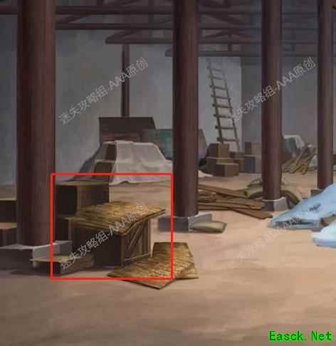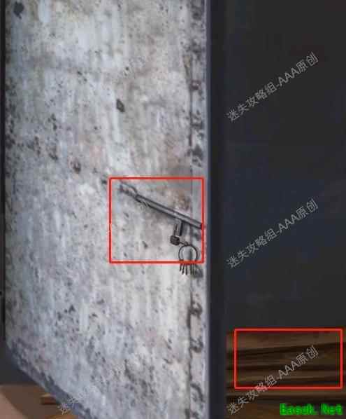 返回起点,向下移动,拾取木板与一串钥匙,按图示完成收集。
