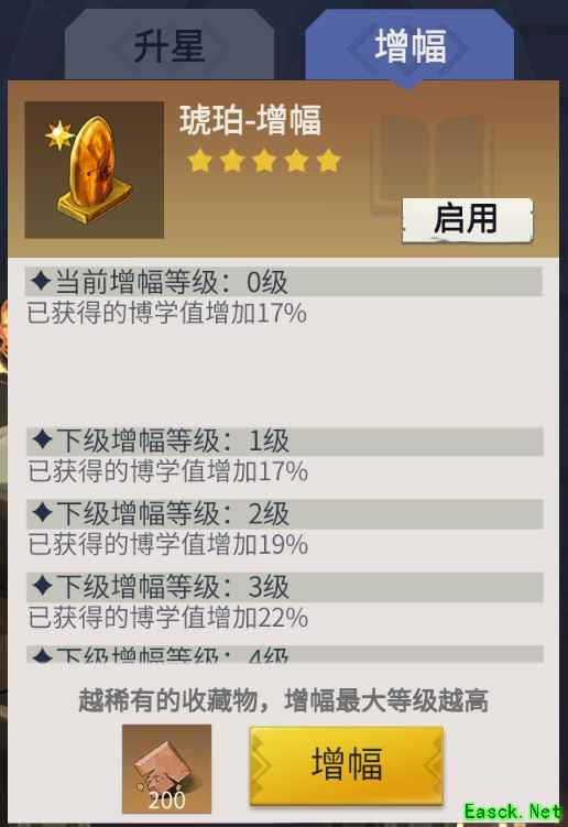 博学值通过点击更多进入藏品界面查看,可提升角色各项基础属性。博学等级最高为80级,达到后即使取消琥珀的满增幅效果,等级也不会下降。使用满增幅琥珀能快速提升博学等级,据经验,在65级或75级左右使用即可直接升至满级。因此,满增幅琥珀虽效果显著,但仅能使用一次,属于一次性关键道具,合理把握使用时机尤为重要。