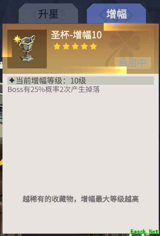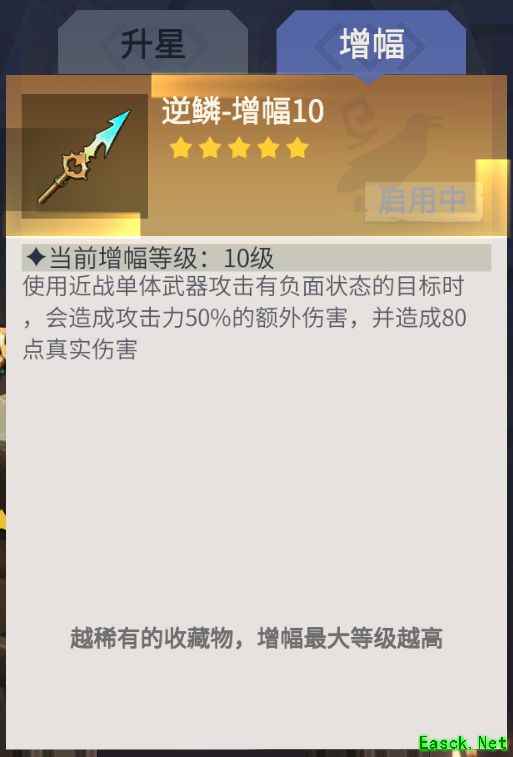 主要用于75级多人副本,多数情况下使用单手剑,可提升一定攻击力。10级增幅等级能使藏品属性加成达到10%,在凑战力时较为实用,其余情况则视需求而定。