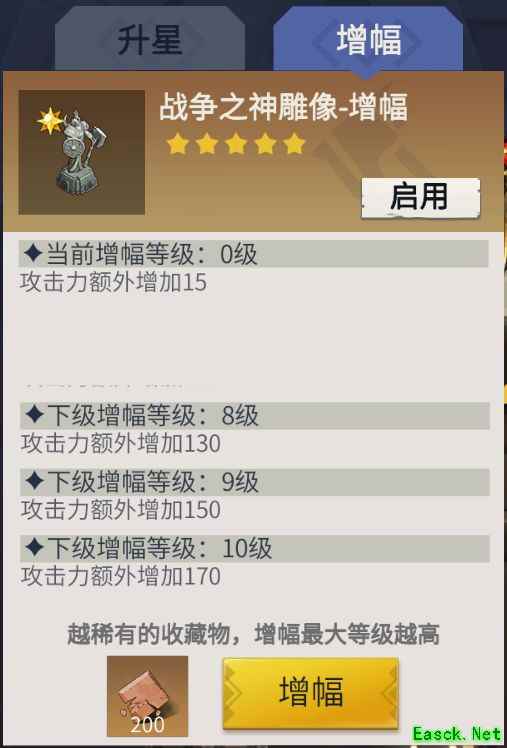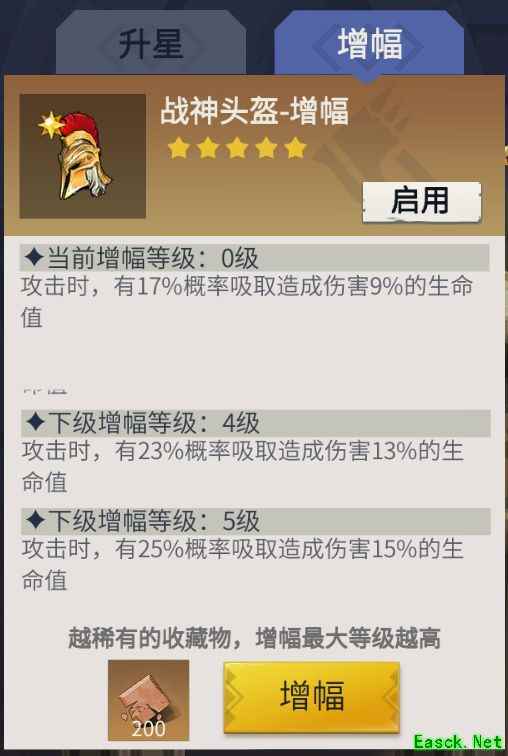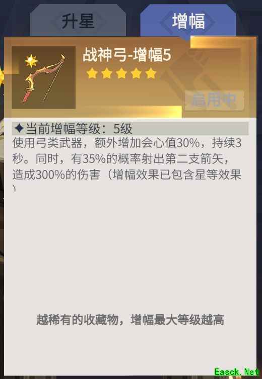 每件藏品进行增幅均需消耗200个1级神级藏品碎片,但不同藏品的增幅等级存在差异,有的为3级,有的为5级,大多数则可提升至10级。当选择五件达到10级的藏品进行增幅时,角色各项属性将获得10%的加成,效果十分显著。然而,多数玩家日常使用的主力藏品为战神弓,其增幅上限仅为5级,因此常规属性提升为5%。在追求排行榜战力排名时,玩家可通过切换其他高阶藏品来临时提升战力,切换操作需消耗100个神级藏品碎片,是一种灵活应对高强度竞争的策略手段。