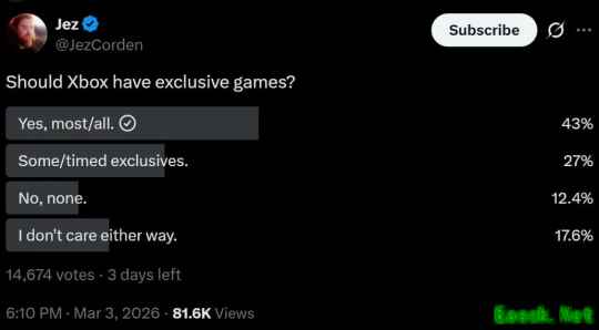 据外媒游戏记者Jez Corden的一份个人调查(超1.4万人参与投票),43%的玩家支持Xbox推出独占游戏。另有27%的玩家支持限时独占。只有12.4%的玩家不希望Xbox有独占。这意味着70%的玩家倾向于Xbox有独占游戏。