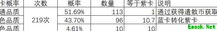 理论上获得60紫碎(相当于1张紫卡)需遣散约113张普卡,经历219次抽卡,每次抽卡消耗270钻。