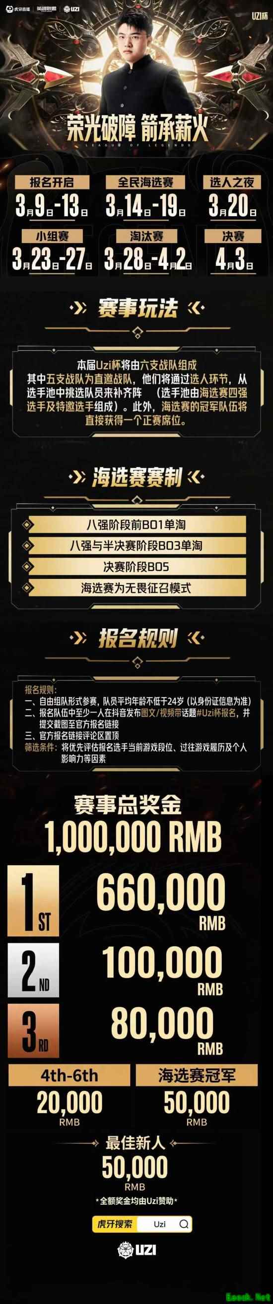 冠军独享66万!亚军10万!季军8万!第四至六名各2万!最佳新人5万!海选赛冠军5万!感谢Uzi选手赞助全额奖金!