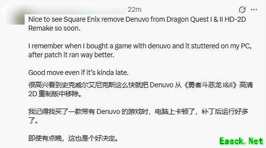 不少玩家对这一操作表示认可,认为SE的选择十分明智:游戏已经度过发售初期的核心销售周期,而D加密本身会对游戏运行流畅度造成影响,移除后能显著优化玩家的游戏体验,不少网友也对这一观点表示认同。不过也有玩家对此次改动的背后原因提出质疑,直言“他们会不会是用更糟糕的东西替代了D加密”。
