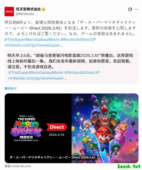 任天堂官方于今日发布推文,宣布将于 2026 年 3 月 10 日日本时间早上 6 点(北京时间早上 5 点)播出《超级马力欧银河大电影》Direct,这是该电影剧场公映前的最后一次直播活动。