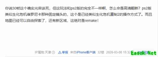 该帖引发了玩家群体的广泛讨论。多数玩家对游戏锁定30帧的设计表示无法接受,有玩家直言,随着AI技术的普及,这类低质量的重制作品或将愈发常见;也有观点认为,该作本质是情怀向作品,受众局限于系列核心粉丝。