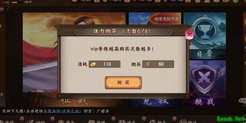 可通过元宝直接购买体力,购买次数随VIP等级提升而增加,最多八次。随着购买次数增多,单价也会相应提高。建议每日至少购买一次,花费50元宝可获得60点体力,既能完成日常任务,又能获取升级经验,性价比最高推荐购买1至2次。