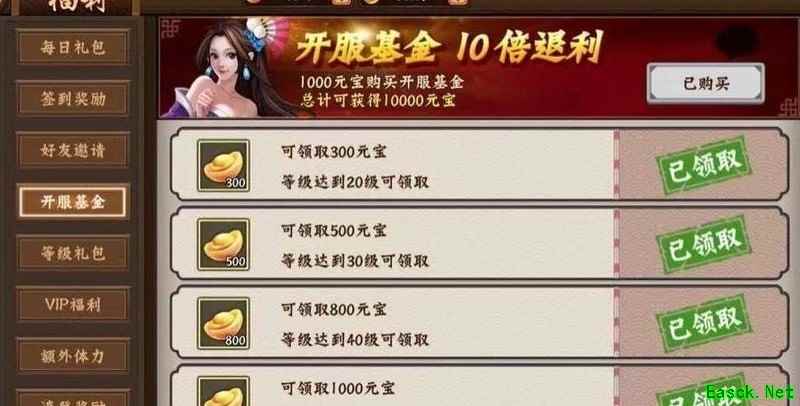 花费1000元宝可享十倍回报,达到指定等级即送阶段元宝奖励,轻松领满全服仅限一次购买机会,VIP4级即可解锁购买资格。