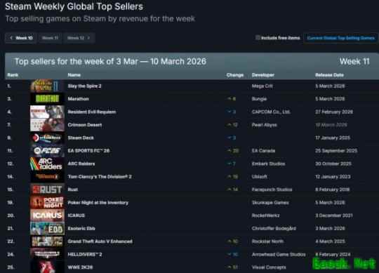 Steam2026年最新一周游戏销量排行榜出炉(2026年3月3日-2026年3月10日,无免费游戏),本周经典卡牌肉鸽续作《杀戮尖塔2》正式发布,打破了《生化危机9》的三连冠,成功夺冠,除此之外,即将发布的3A大作《红色沙漠》预购人数火爆,获得了第四名的好成绩,之后还有诸多大作回归榜单,让我们一起来看看具体前十名有哪些佳作吧!