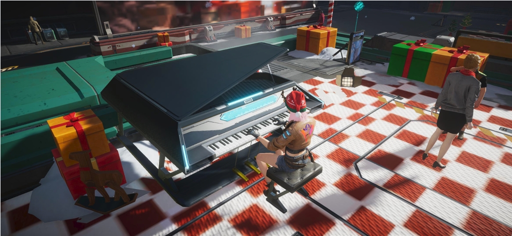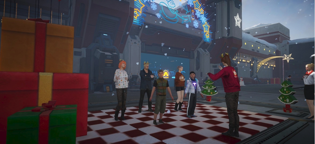 玩累了还可以逛逛避难所。来一场末日city walk!这里早已经换上了超有圣诞氛围的装饰,先来光顾一下唱诗班,哼着小调,享受一首小曲,再去隔壁的小吃摊,吃吃小美食。走完一圈,还能回公会里面泡泡澡~此时此刻,小编多么希望,我也能魂穿《星球:重启》,来一场度假!