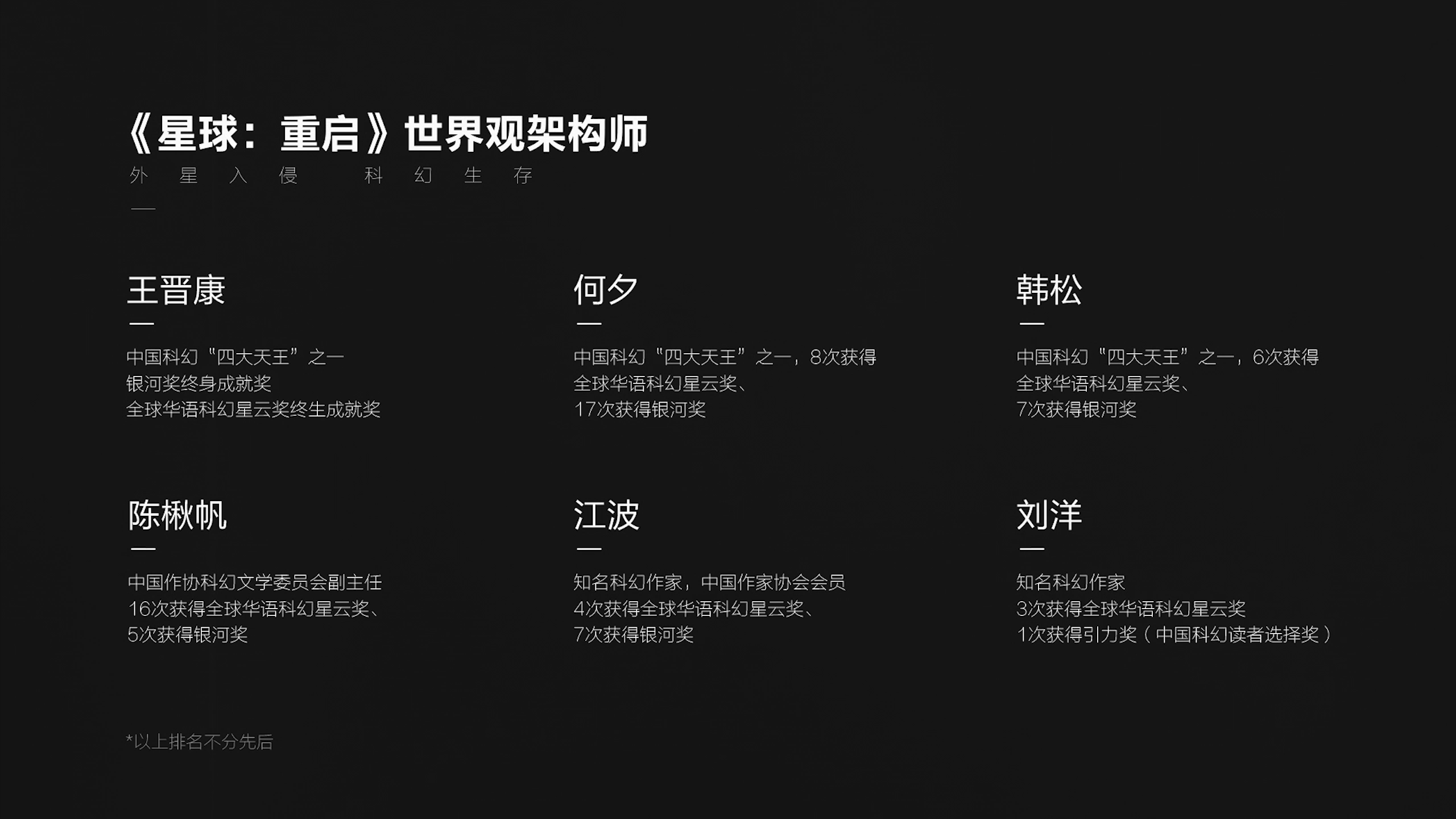 去年底,《星球:重启》还荣获了由华语科幻第一人刘慈欣颁发的“华语科幻星云奖最佳游戏创意奖”。颁奖时,刘慈欣对游戏发表高度评价:“《星球:重启》把中国科幻从纸张和银幕上精心剪裁下来,编织进浩瀚的程序里,给予每个人决策星球未来命运的责任和能力,让我们得以探测到光年之外的星云中,全新的轨迹。”