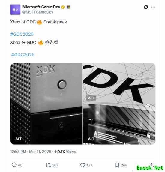 近日,微软游戏开发部门通过其官方 X 账号发布了一组疑似 Xbox 开发机 “Xbox 开发工具包(XDK)” 的照片,内容或与正在美国旧金山举办的 “GDC 游戏节 2026” 展会相关。