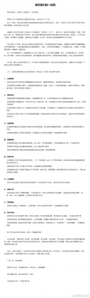 官方表示,此次延期是因为完全版内容量激增、开发环境变化,太吾世界的测试难度也随之指数级提升,为了排查潜在错误、优化玩家体验,团队选择坚守品质原则,将发布时间推迟两个月。为弥补玩家的期待落空,完全版发布时会额外赠送一个具有纪念意义的免费DLC。