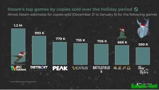 第三方统计机构发布的2025年圣诞假期期间(12月21日-1月5日)Steam上最畅销游戏排名。这份榜单既有3A大作,也有3A和小型独立游戏