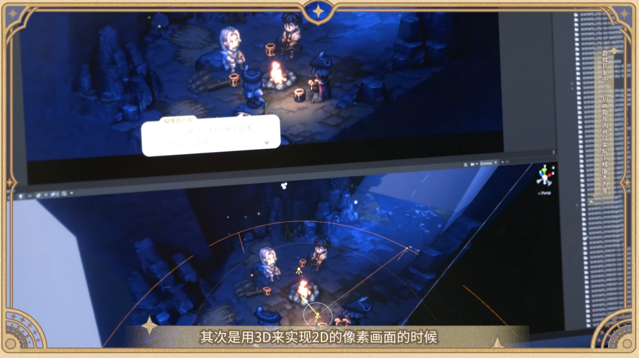 游戏为了实现像素风,采用了帧动画的方式。这种操作,能更好的传承像素风的特点,同时让画面更生动,但代价是工期和成本都要比骨骼动画高。同时用3D来实现2D效果时,模型并非是玩家们看到的画面,需要运用一些“障眼法”来达成特定效果,同样也很考验设计者的功力。