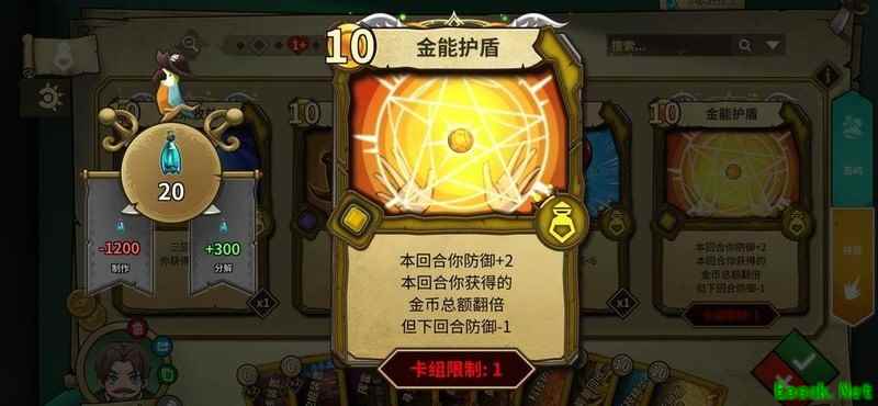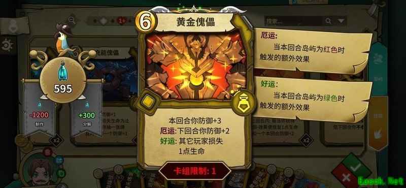 本回合防御提升2点,下回合降低1点,搭配科技护盾等于本回合防御加4并恢复一点生命,金币翻倍看运气,即使绿岛无牌也有机会取胜。