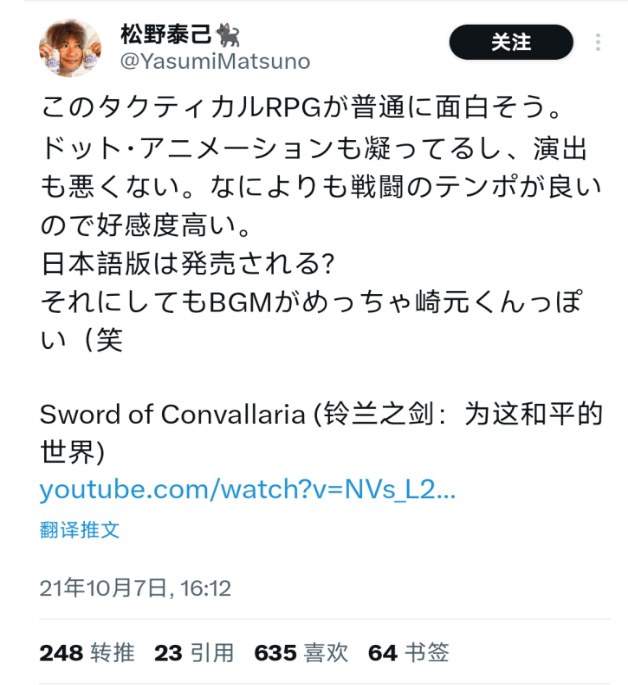 这其实并非是松野泰己乃至日本游戏界第一次关注到《铃兰之剑》。早在两年前游戏正封闭测试时,松野泰己就在自己高强度直播《FF14》下本进度的推特上推荐了这款游戏。松野称赞这款游戏“美术细致、战斗节奏很好”,并且直接表示希望游戏发售日语版本。可以说松野泰己本身就是游戏最早的自来水。