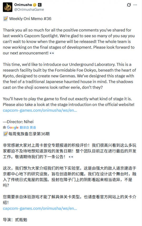 “感谢大家在上周CapcomSpotlight之后留下的众多积极评论。我们很高兴看到很多玩家表示已经迫不及待想知道游戏的发售时间了!目前整个开发团队已经进入开发的最后阶段,请大家期待我们接下来的新消息公布!