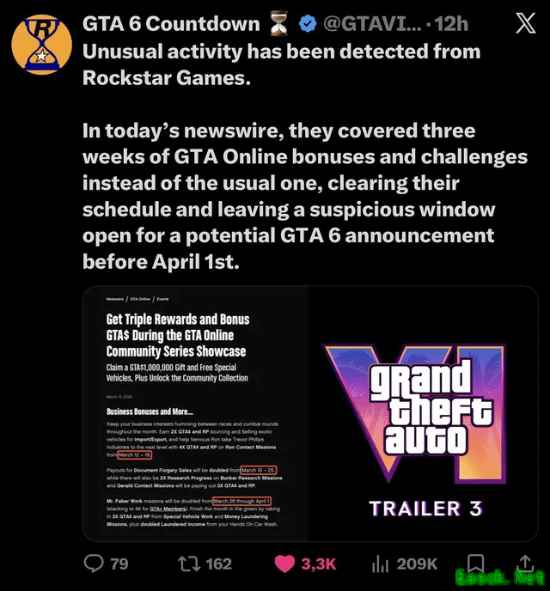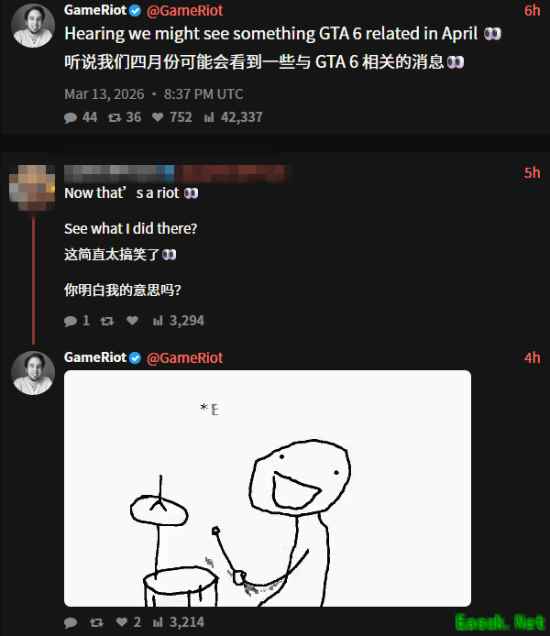 油管爆料博主@GameRiot也在个人社交平台暗示“4月份将会迎来《GTA6》的相关消息”。同时他还否认了并非是游戏跳票的消息。